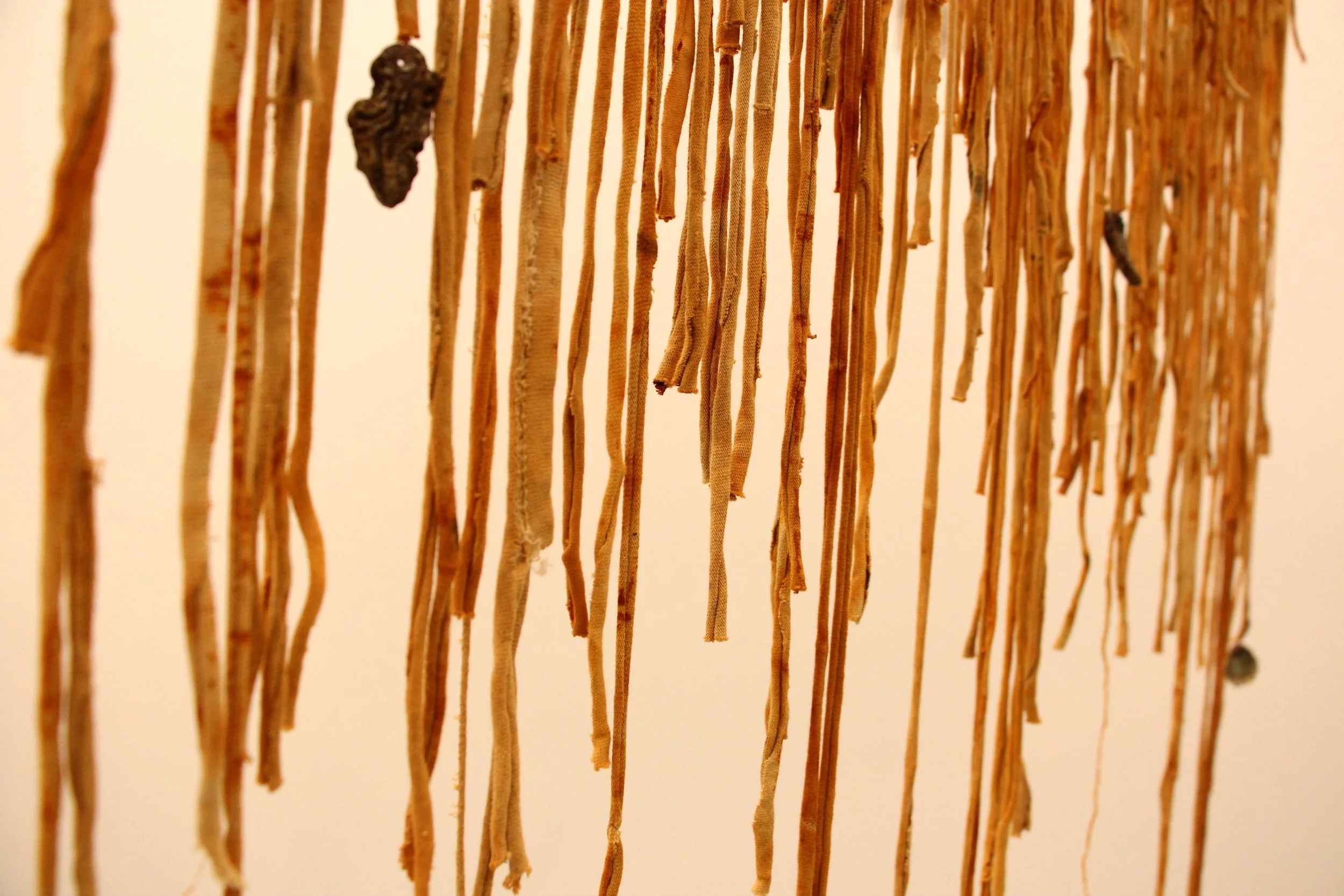 Emma Pinsent, 'Residual edges' detail, 2023. Cotton t-shirt, rust, copper wire, nickel bronze, seawater patina, pine dune fence post, wire, and stainless steel hooks. Image courtesy of the artist.