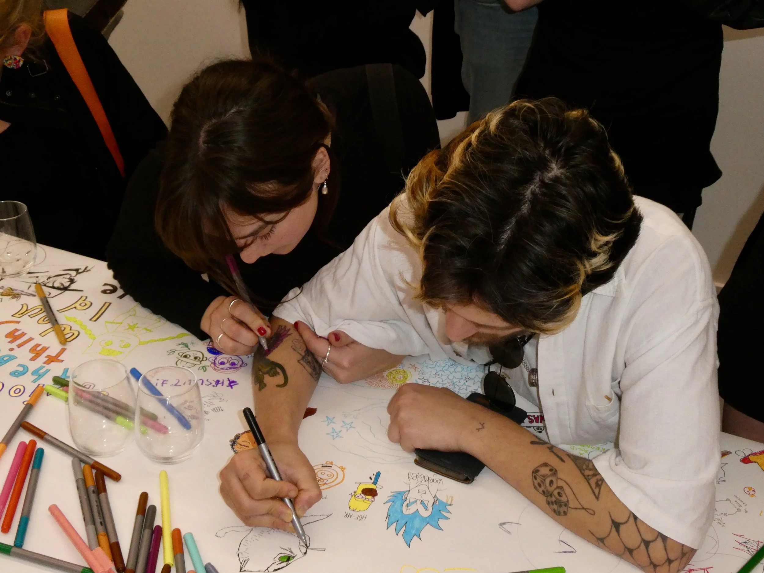 Various artists, community drawing table on opening night of TEXTA, 2023. Texta on paper. Photography by Maddy Press.